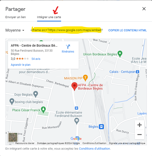 Se rendre sur google map > partager > Intégrer une carte > Copier le contenu HTML