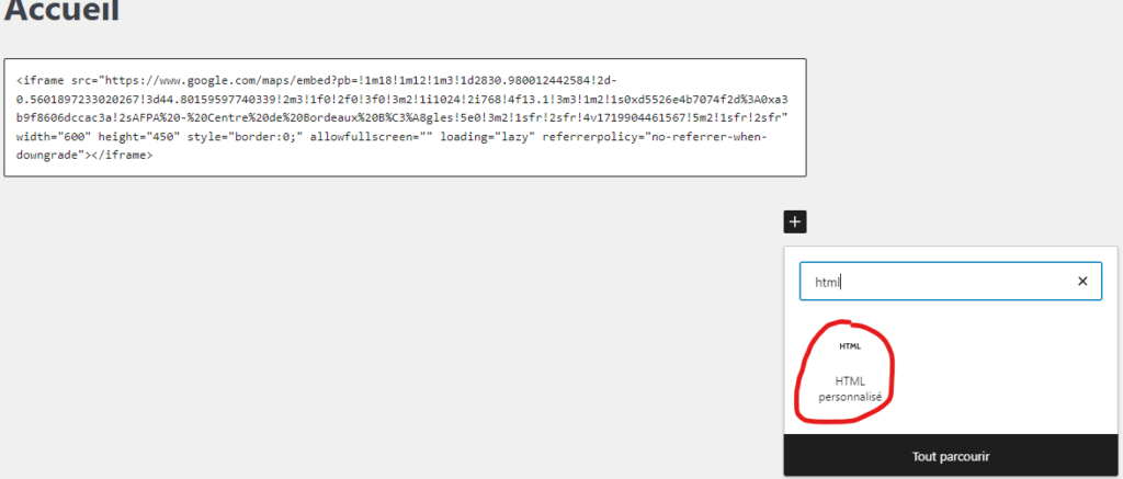 Venir sur l’editeur guthenberg > + > HTML > collé le contenu