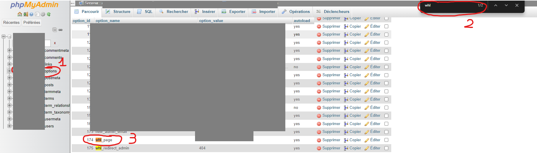 Se rendre sur myphpadmin > écrire le préfixe du site a gauche > afficher toutes les pages > ctrl +f et taper whl